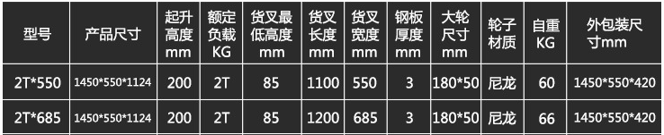 搬運(yùn)車分為兩種型號(hào):550型和685型,其具體的相關(guān)尺寸見上圖所示。其輪子也分為2種,一種是尼龍輪,一種是橡膠輪。尼龍輪適合水泥地面,橡膠輪適合大理石、油漆、環(huán)氧地面。
