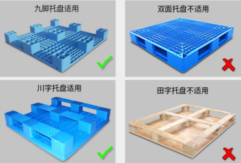 要盡可能選用國際標準的托盤規(guī)格,以便于托盤的交換和使用。一般的叉車都適用九腳托盤、川字托盤,并且九腳托盤和川字托盤的內(nèi)寬均需要大于貨叉的外寬。像田字托盤和雙面托盤并不適用所有的搬運車。